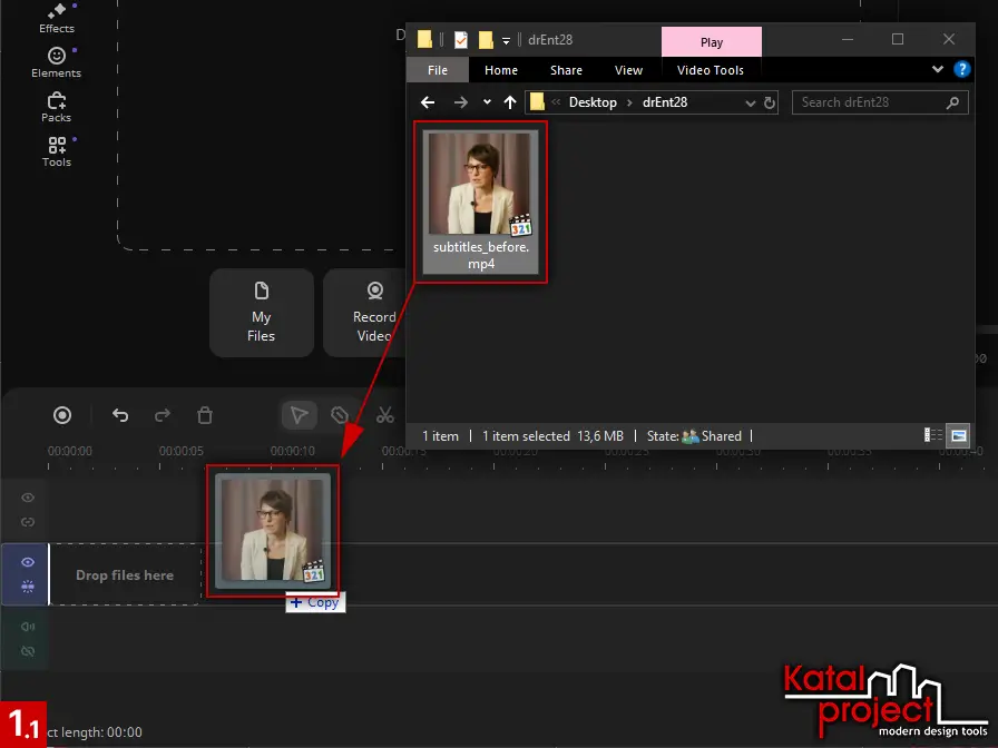 Запускаем Мовавика Видео и перетаскиваем исходное видео, скачать которое можно по ссылке, из Проводника Windows на монтажный стол видеоредактора.