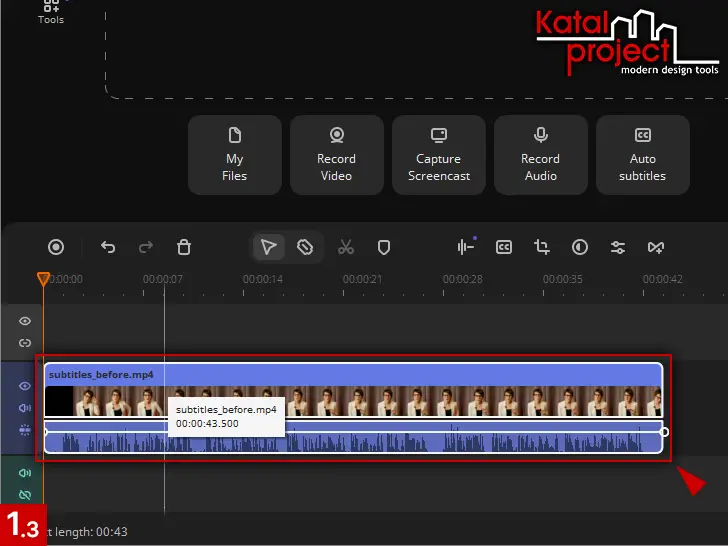Хватаемся за начало первого клипа на дорожке титров, который соответствует 1 реплике субтитров, и перетаскиваем его вправо, в момент 00:01:250.