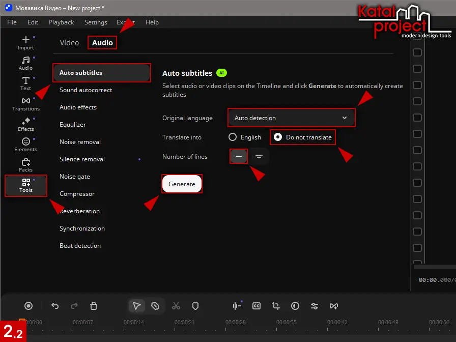 Auto subtitles (Автосубтитры) (панель инструментов над монтажным столом). В одноименном окне выбираем настройки:- Original language (Язык оригинала) – Auto detection (Автоопределение);