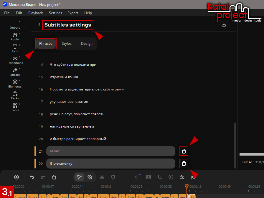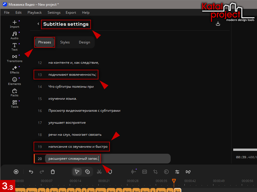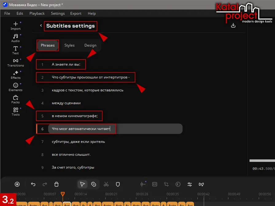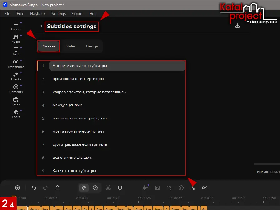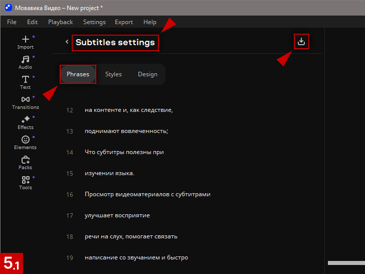 В разделе Phrases (Реплики) окна Subtitles settings (Настройки субтитров) редактируем распознанные нейросетью реплики: