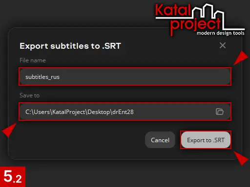 Export to SRT (Сохранить в SRT), расположенной в верхнем правом углу окна Subtitles settings (Настройки субтитров), вызываем диалоговое окно Export subtitles to SRT (Сохранение субтитров в SRT), в котором:- в поле File name (Имя файла) вводим название для будущего файла субтитров – subtitles_rus;