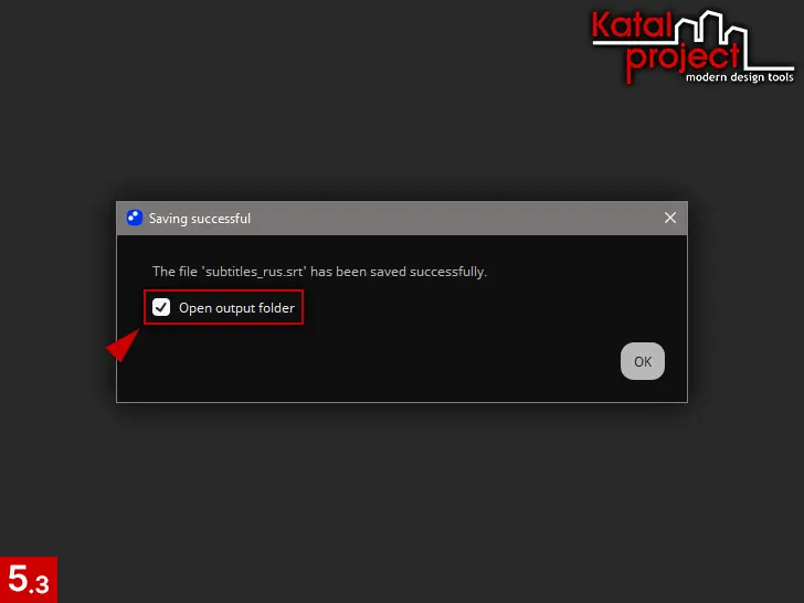 Нажимаем кнопку Export to SRT (Сохранить в SRT). После успешного экспорта субтитров появится окошко Saving successful (Сохранение завершено). В нем ставим галочку Open output folder (Открыть в папке) и жмем OK. В результате откроется окно Проводника Windows с готовым SRT-файлом субтитров, который можно открыть в любом текстовом редакторе.