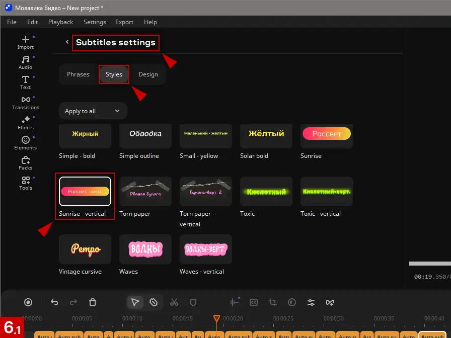 В окне Subtitles settings (Настройки субтитров) открываем раздел Styles (Стили). Проверяем, чтобы из выпадающего списка в верхней части раздела был выбран вариант Apply to all (Применить ко всем). Затем находим шаблон Sunrise - vertical (Рассвет - верт) и делаем клик по его карточке. В результате данный шаблон будет применен ко всем титрам с репликами.