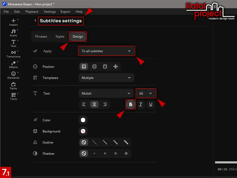 В окне Subtitles settings (Настройки субтитров) переходим в раздел Design (Дизайн), в котором: