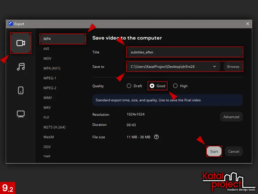 Save video file (Сохранить как видеофайл), выбираем настройки:- формат – MP4;