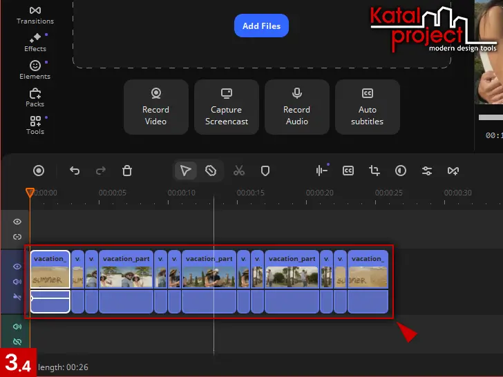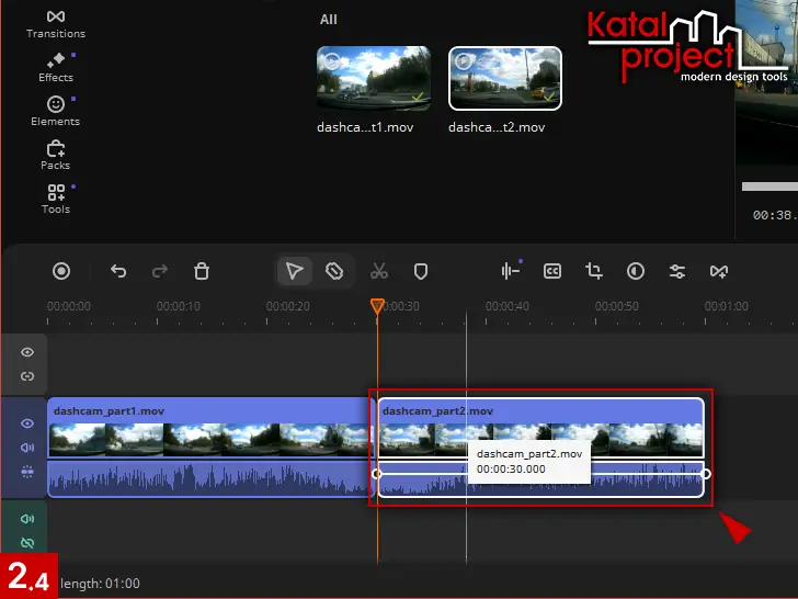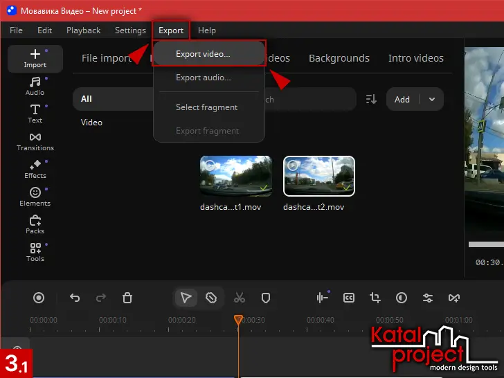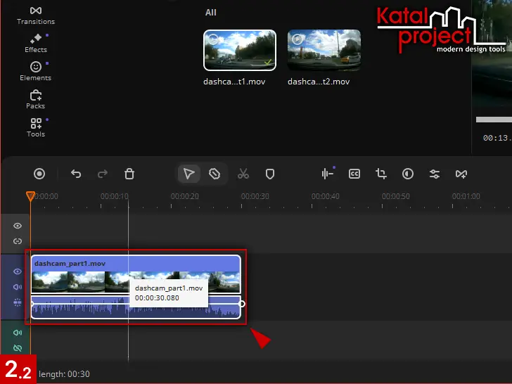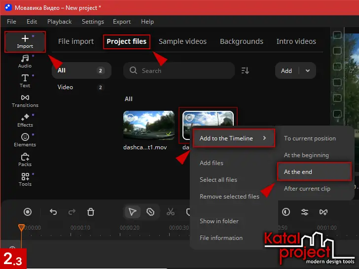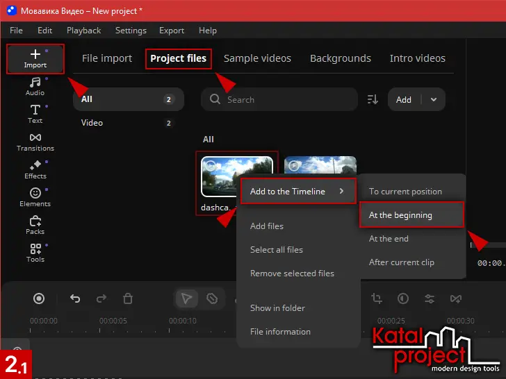 В разделе Project files (Файлы проекта) находим и выделяем первое видео – dashcam_part1.mov. Кликом правой кнопкой мыши по его карточке вызываем контекстное меню и берем из него команду Add to the Timeline (Добавить на таймлайн) > At the beginning (В начало).