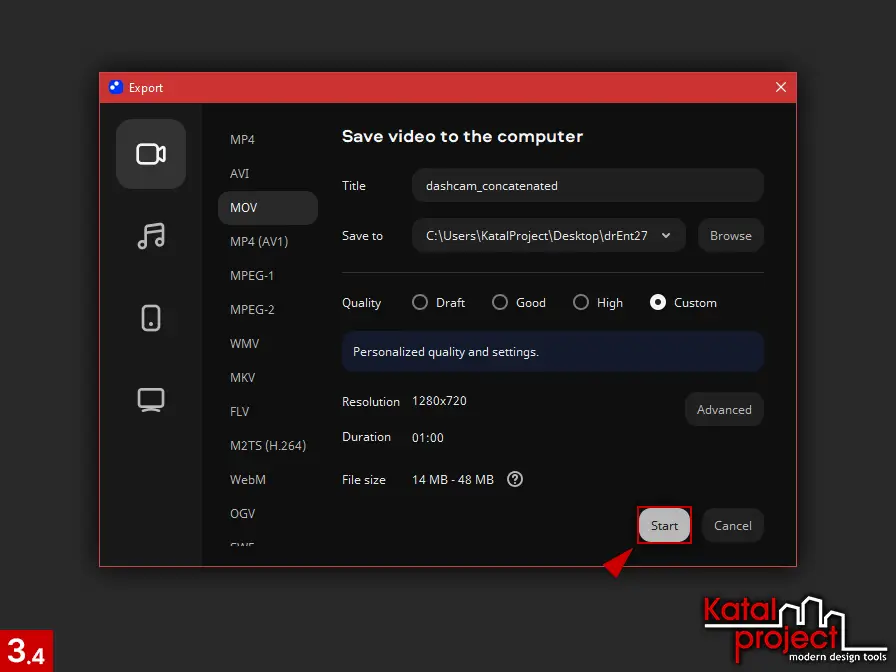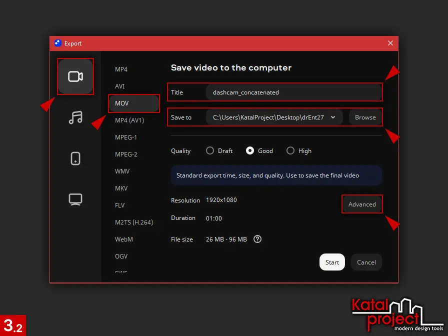- в поле Title (Название) вводим имя будущего видеофайла – dashcam_concatenated;