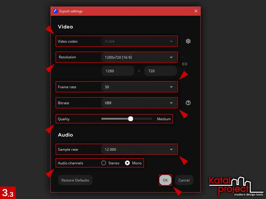 - Audio channels (Аудиоканалы) – Mono (Моно).