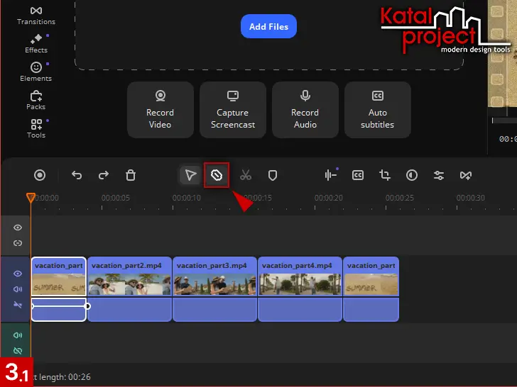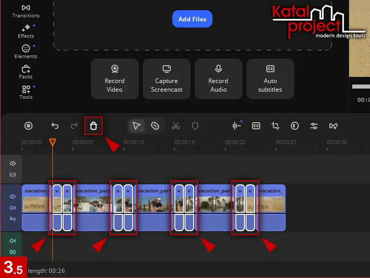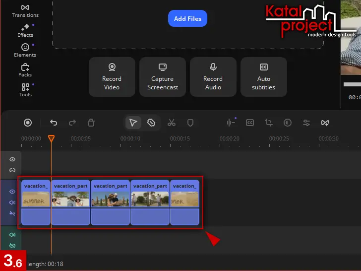 - Второй, третий и четвертый клипы (продолжительностью по 6 секунд) – в начале и в конце – кликаем по ним в моментах 00:05.000, 00:09.000, 00:11.000, 00:15.000, 00:17.000 и 00:21.000;