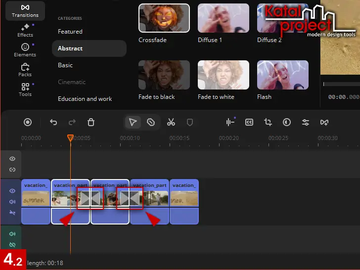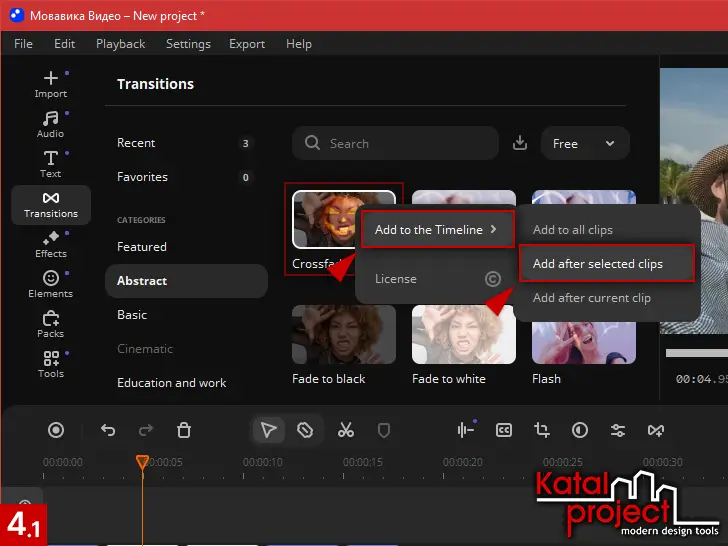Transitions (Переходы) и выбираем категорию Abstract (Абстрактное). В ней находим переход Crossfade (Растворение) и кликаем по его карточке правой кнопкой мыши. Из открывшегося контекстного меню берем команду Add to the Timeline (Добавить на таймлайн) > Add after selected clips (Добавить после выбранных клипов).
