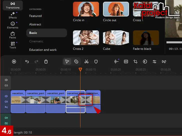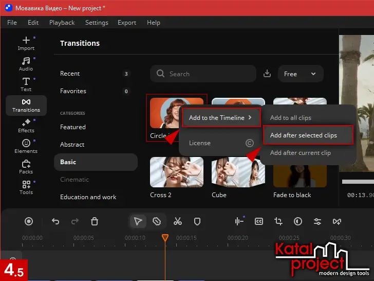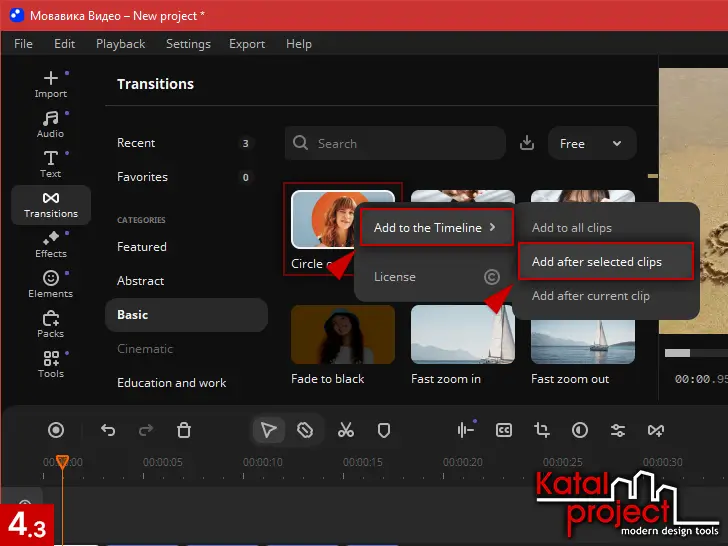 Добавление переходов между вторым и третьим, третьим и четвертым клипами На монтажном слоте выделяем первый клип. Переходим в категорию Basic (Базовые) и находим в ней переход Circle out (Круг из центра). Кликом правой кнопкой мыши по его карточке вызываем контекстное меню и берем из него команду Add to the Timeline (Добавить на таймлайн) > Add after selected clips (Добавить после выбранных клипов).
