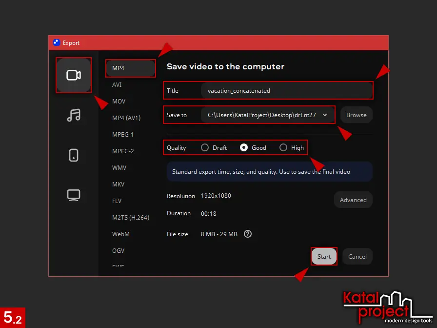 В приведенном примере предполагается, что видео будут располагаться в последовательности, которая соответствует нумерации файлов, то есть: 1 – vacation_part1.mp4; 2 – vacation_part2.mp4; 3 – vacation_part3.mp4; 4 – vacation_part4.mp4; 5 – vacation_part5.mp4.